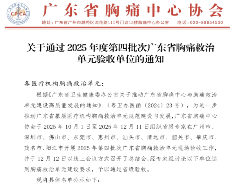 近日,廣東省胸痛中心協(xié)會(huì)正式公布2025年度第四批次胸痛救治單元驗(yàn)收結(jié)果,始興縣中醫(yī)院與始興縣深渡水瑤族鄉(xiāng)衛(wèi)生院順利通過驗(yàn)收。至此,始興縣規(guī)劃建設(shè)的1個(gè)縣級(jí)和10個(gè)鄉(xiāng)鎮(zhèn)胸痛救治單元全部通過省級(jí)驗(yàn)收,成功實(shí)現(xiàn)縣域胸痛救治單元全覆蓋,成為韶關(guān)市首個(gè)實(shí)現(xiàn)縣域內(nèi)胸痛救治單元全覆蓋的縣,為轄區(qū)群眾生命健康筑牢堅(jiān)實(shí)防線。