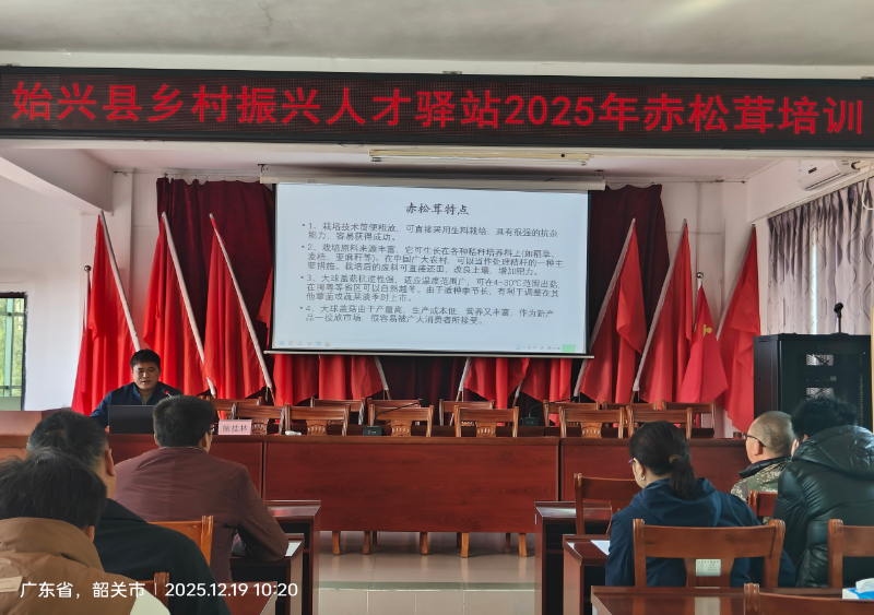 12月19日上午,一場以“赤松茸產業賦能鄉村振興:技術引領,人才先行”為主題的種植技術培訓活動在始興縣司前鎮火熱開展。這是縣人社局依托縣、鎮兩級鄉村振興人才驛站,精準對接本地特色產業發展需求,共同舉辦的一場實用技能培訓。活動旨在培養一批懂技術、會管理、善經營的赤松茸種植鄉土人才,為當地食用菌產業高質量發展注入新活力,夯實鄉村振興的人才基礎。