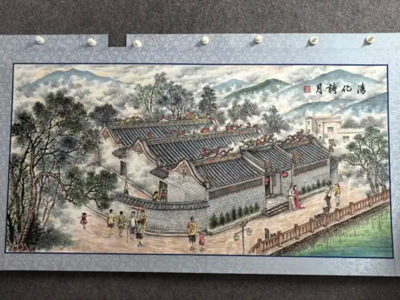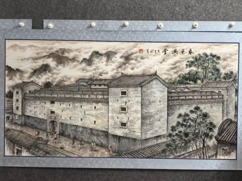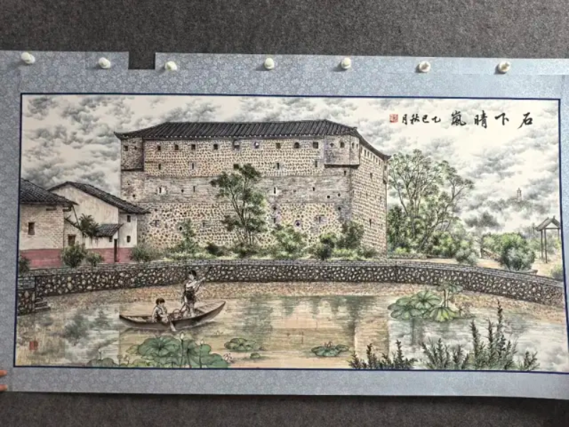對(duì)家鄉(xiāng)的眷戀,催生出創(chuàng)作的靈感。從去年冬天起,張權(quán)帶著畫板走遍始興城鄉(xiāng)。凌晨蹲守墨江邊,只為捕捉第一縷晨光灑向水面的瞬間;深秋鉆進(jìn)彩杉林,追蹤光影在枝葉間流轉(zhuǎn)的軌跡;雨天撐著傘佇立古圍前,記錄雨霧中建筑的朦朧韻致……他收集了上百?gòu)埶夭?反復(fù)琢磨構(gòu)圖與氣韻。“畫‘棟護(hù)晴嵐’時(shí),光是云的層次就改了五遍,就想讓看畫的人能真切感受到石下村雨后的清新。”在他眼中,作畫從來不只是技法的展現(xiàn),更是與故土的一場(chǎng)深度精神對(duì)話。