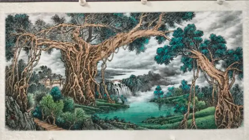 張權(quán)說:“這幅畫是我回來畫的第一幅畫,給它取了一個(gè)名字叫根。盤根錯(cuò)節(jié),扎入泥土。我的根本來就在始興。始興山水那么好,接下來我還想把我們的文創(chuàng)這一塊,包括非遺這一塊的東西融進(jìn)來,一起把它融進(jìn)畫里面,把它做成一個(gè)系列。”