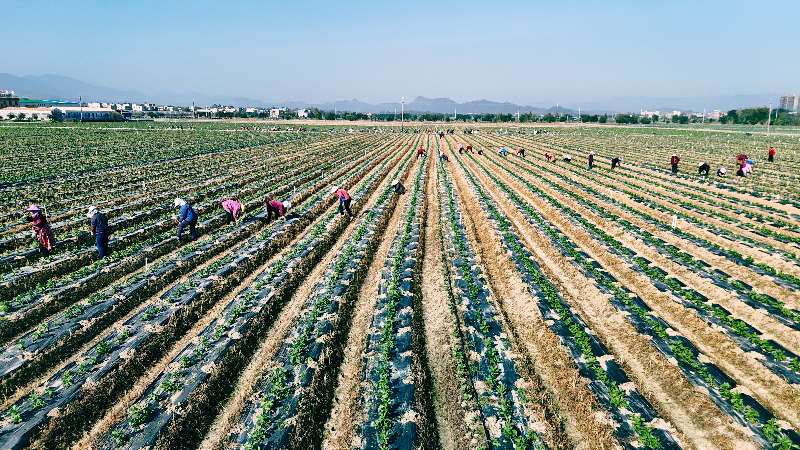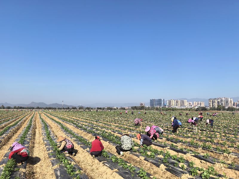 美青農業的蔬菜基地里,田壟整齊如織,滿眼綠意盎然。從高空俯瞰,基地宛如一塊巨大的拼圖,不同種類的蔬菜田塊有序排列,勾勒出規則的線條。雖已入冬,基地卻一派忙碌:蠶豆地里,數十名工人彎腰清苗除草;西蘭花田塊,新栽的菜苗正扎根生長;而兩個月前種下的豆苗、高腳菜心,已郁郁蔥蔥,進入豐產采收期。