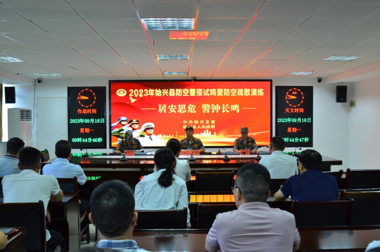 9月18日上午,我縣舉行2023年度始興縣防空警報試鳴暨行政大樓人員防空疏散演練活動。本次活動由縣委書記華關同志任總指揮長,縣委副書記、縣長宋在軍同志任第一副指揮長,縣發改局局長、縣國動辦主任、縣人防辦主任羅祥山同志主持,縣行政大樓各單位主要領導30多人現場觀摩,縣行政大樓全體工作人員、人民防空專業隊消防救援中隊和醫療救護一中隊等600余人參演。