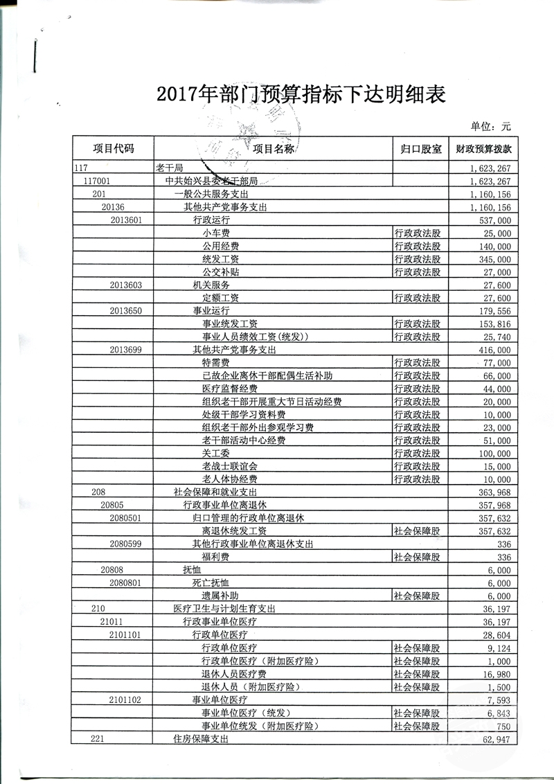 2017年老干部局機構設置1個,老干部局(含老干部活動中心)。