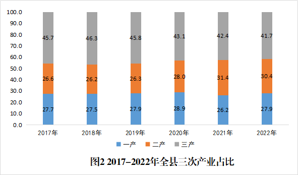 據韶關市地區生產總值統一核算結果,2022年始興縣地區生產總值101.89億元,同比增長2.1%。其中,第一產業增加值28.37億元,增長6.9%,經濟增長貢獻率為91.0%;第二產業增加值31.01億元,下降1.7%,經濟增長貢獻率為-24.0%;第三產業增加值42.50億元,增長1.6%,經濟增長貢獻率為33.0%;三次產業結構為27.9:30.4:41.7。
