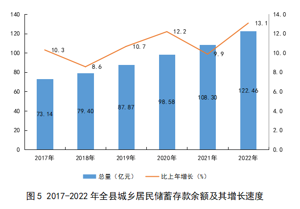 年末全縣金融機構存款余額(本外幣)148.37億元,增長6.9%;住戶儲蓄存款余額122.46億元,增長13.1%;年末金融機構貸款余額(本外幣)86.83億元,增長23.8%,其中,住戶貸款50.30億元,增長7.5%。住戶貸款中,中長期貸款46.2億元,增長9.6%;消費貸款34.73億元,增長2.0%,年末金融存貸比為58.5%。
