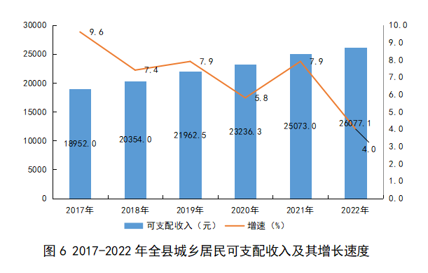全年全縣城鄉居民可支配收入26077.1元,增長4.0%,城鎮居民可支配收入32709.6元,增長2.6%;農村居民可支配收入21238.9元,增長4.7%。