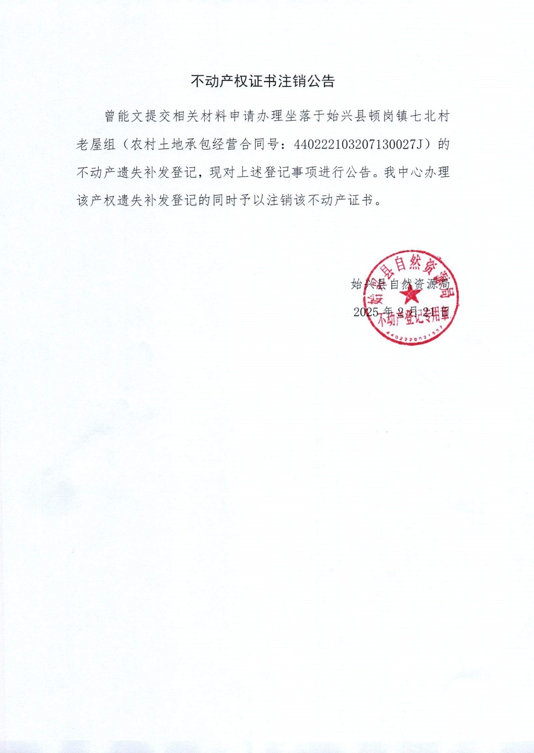 不動產(chǎn)權(quán)證書注銷公告(曾能文)