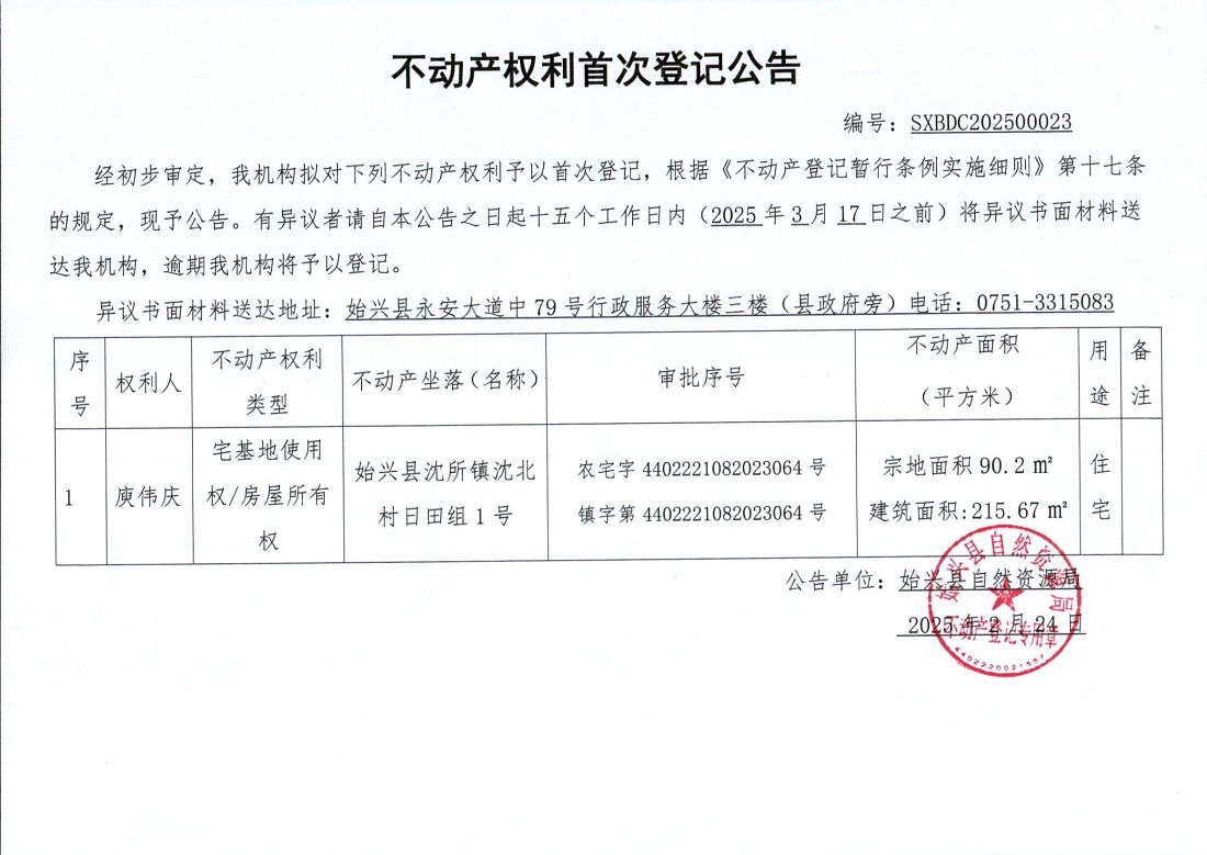 不動產權利首次登記公告(庾偉慶)