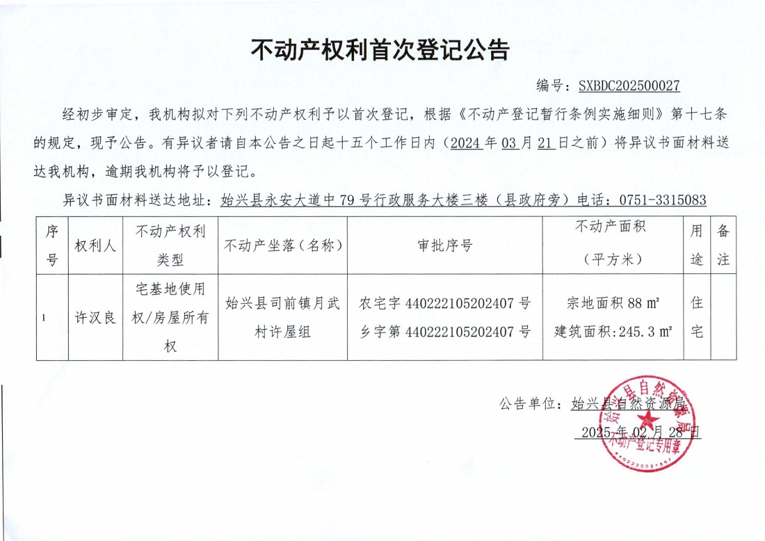 不動(dòng)產(chǎn)權(quán)利首次登記公告(許漢良)