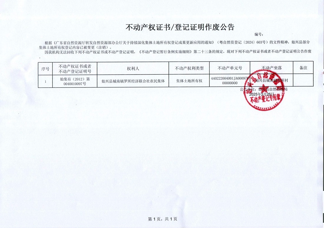 不動產權證書/登記證明作廢公告(始興縣城南鎮羅所經濟聯合社農民集體)