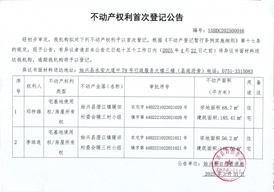 不動產(chǎn)權利首次登記公告(鄧祚雄、李球連)