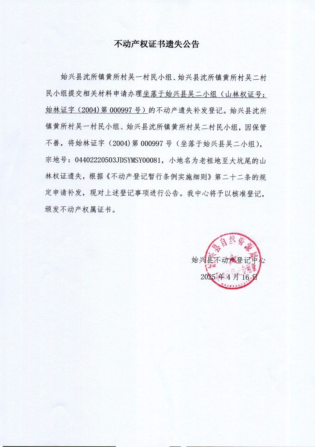 不動產(chǎn)權(quán)證書遺失公告(始興縣沈所鎮(zhèn)黃所村吳一、吳二小組)