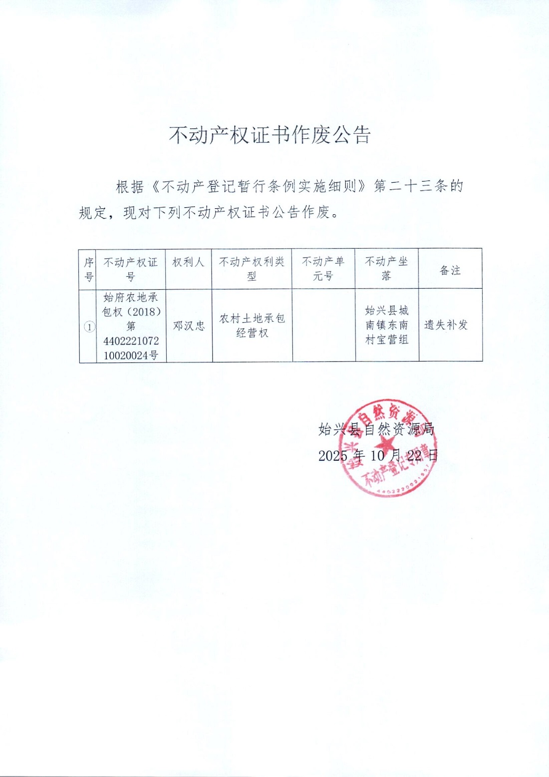 不動(dòng)產(chǎn)權(quán)證書作廢公告(鄧漢忠)