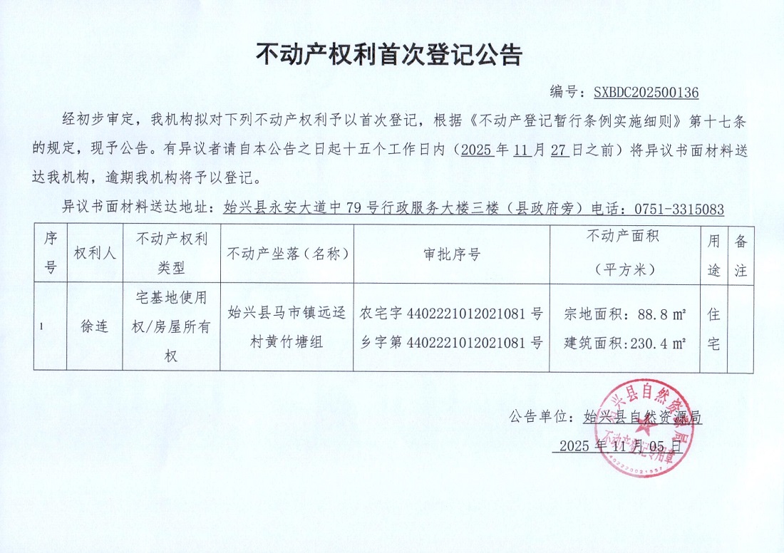不動(dòng)產(chǎn)權(quán)利首次登記公告(徐連)