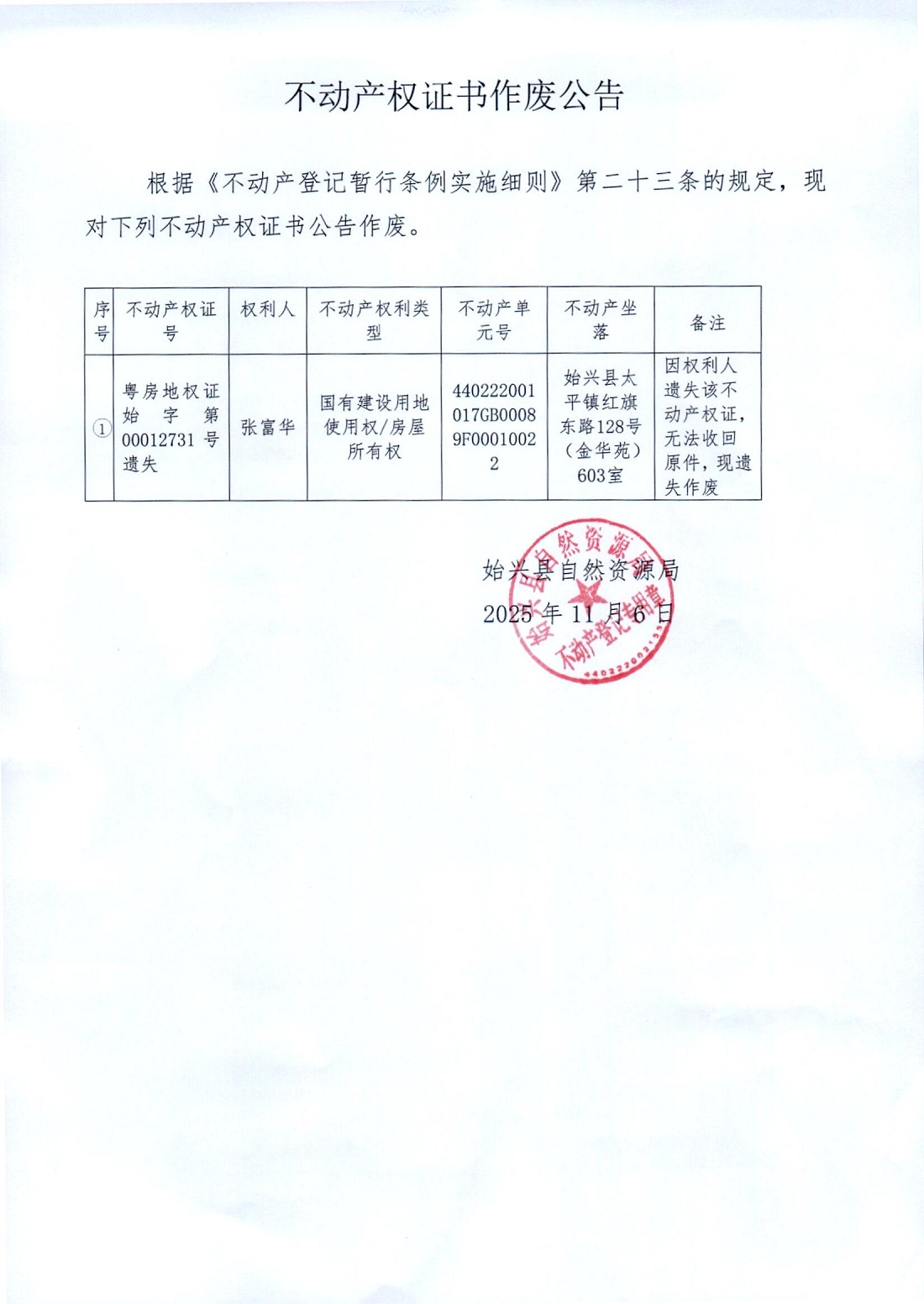 不動(dòng)產(chǎn)權(quán)證書作廢公告(張富華)