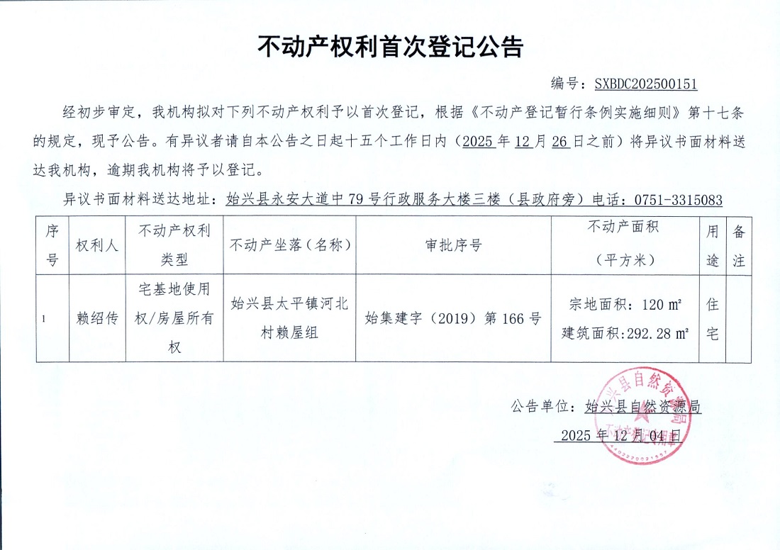 不動產權利首次登記公告(賴紹傳)