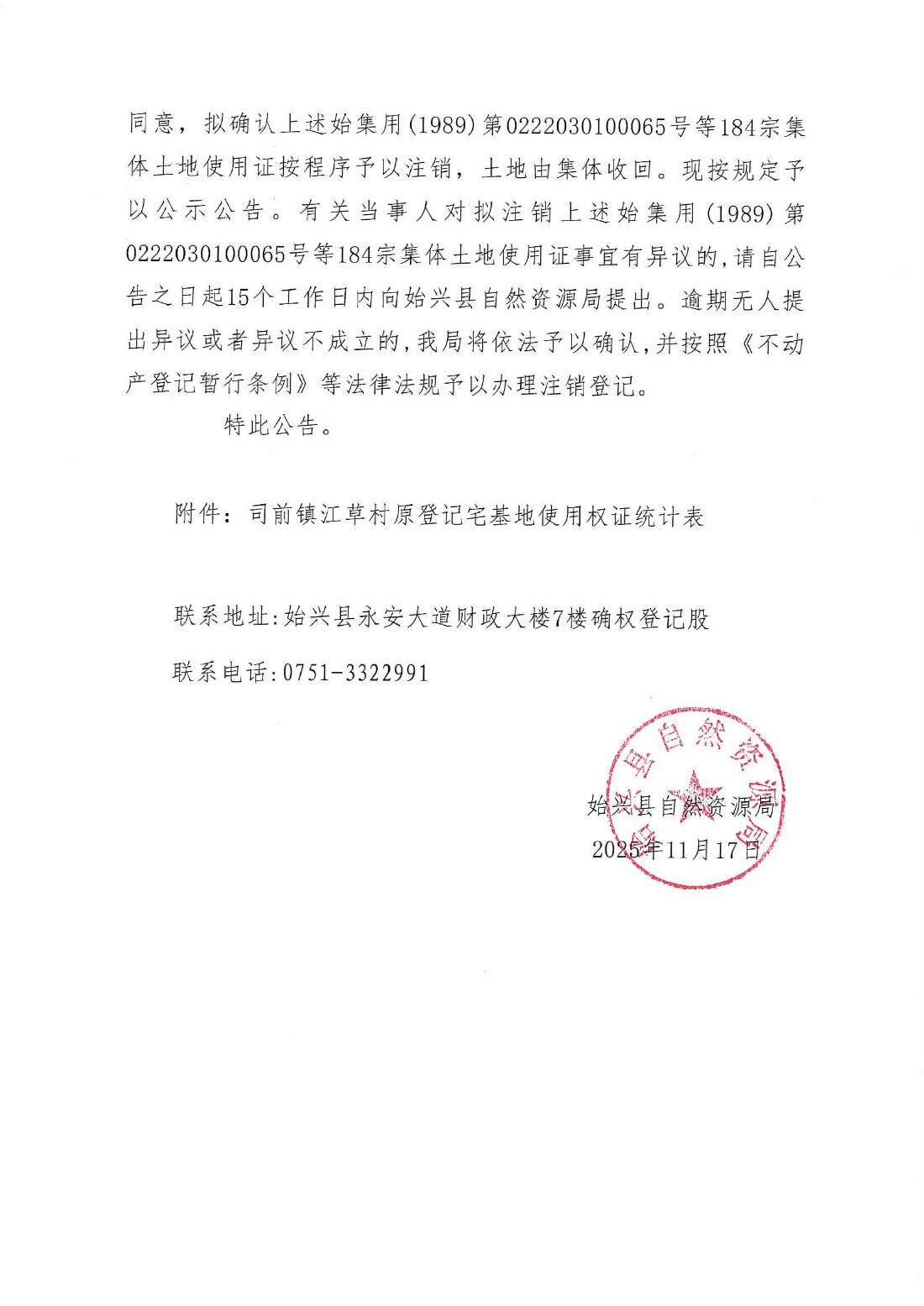 關于注銷始集用(1989)第0222030100065號等184宗產權證書的公告