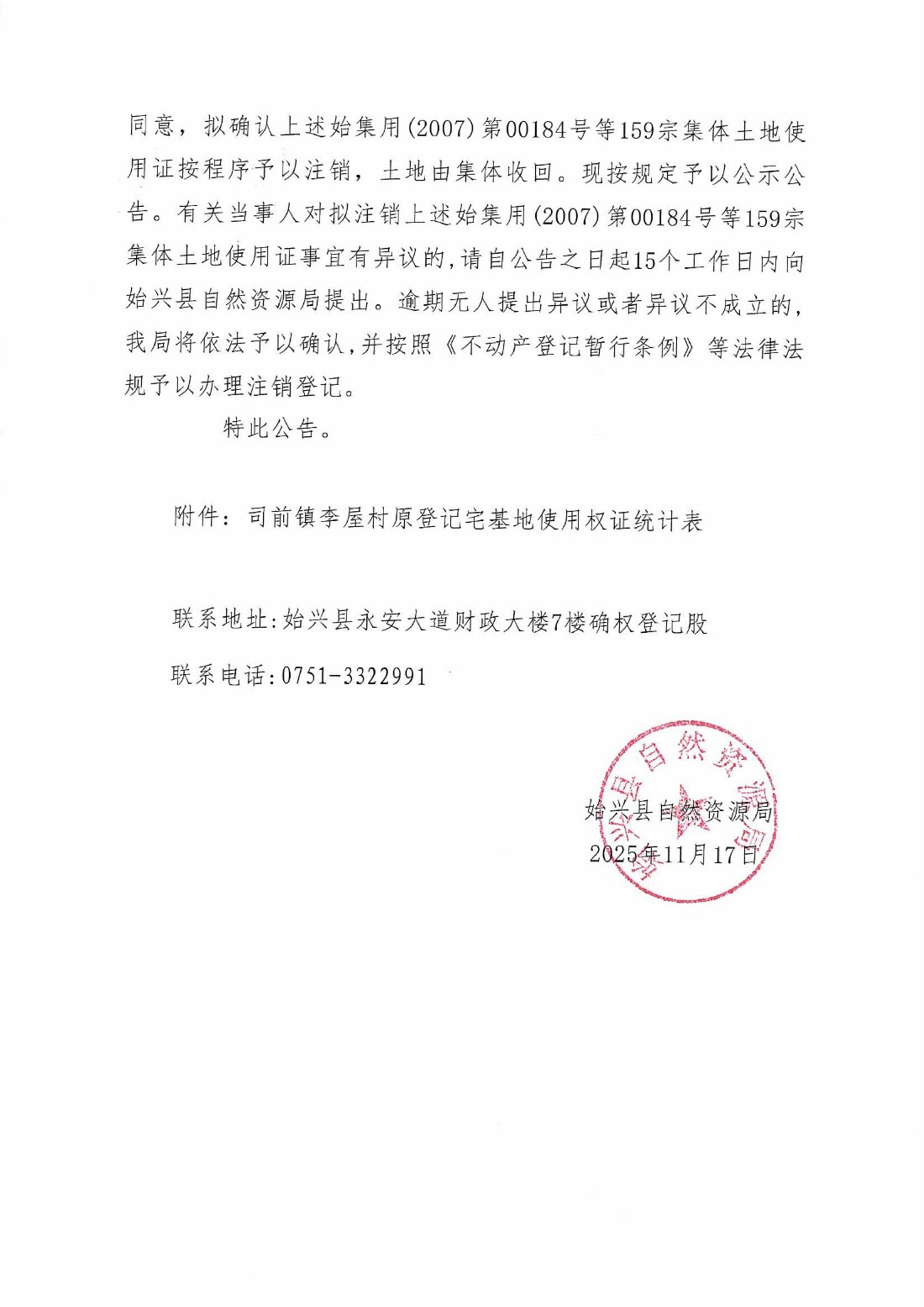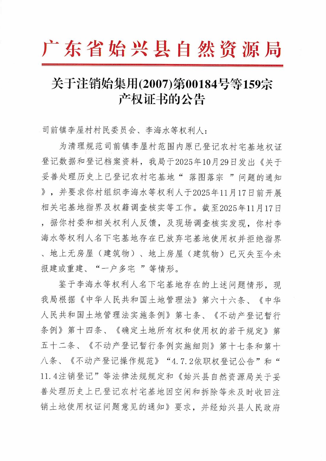 關于注銷始集用(2007)第00184號等159宗產權證書的公告