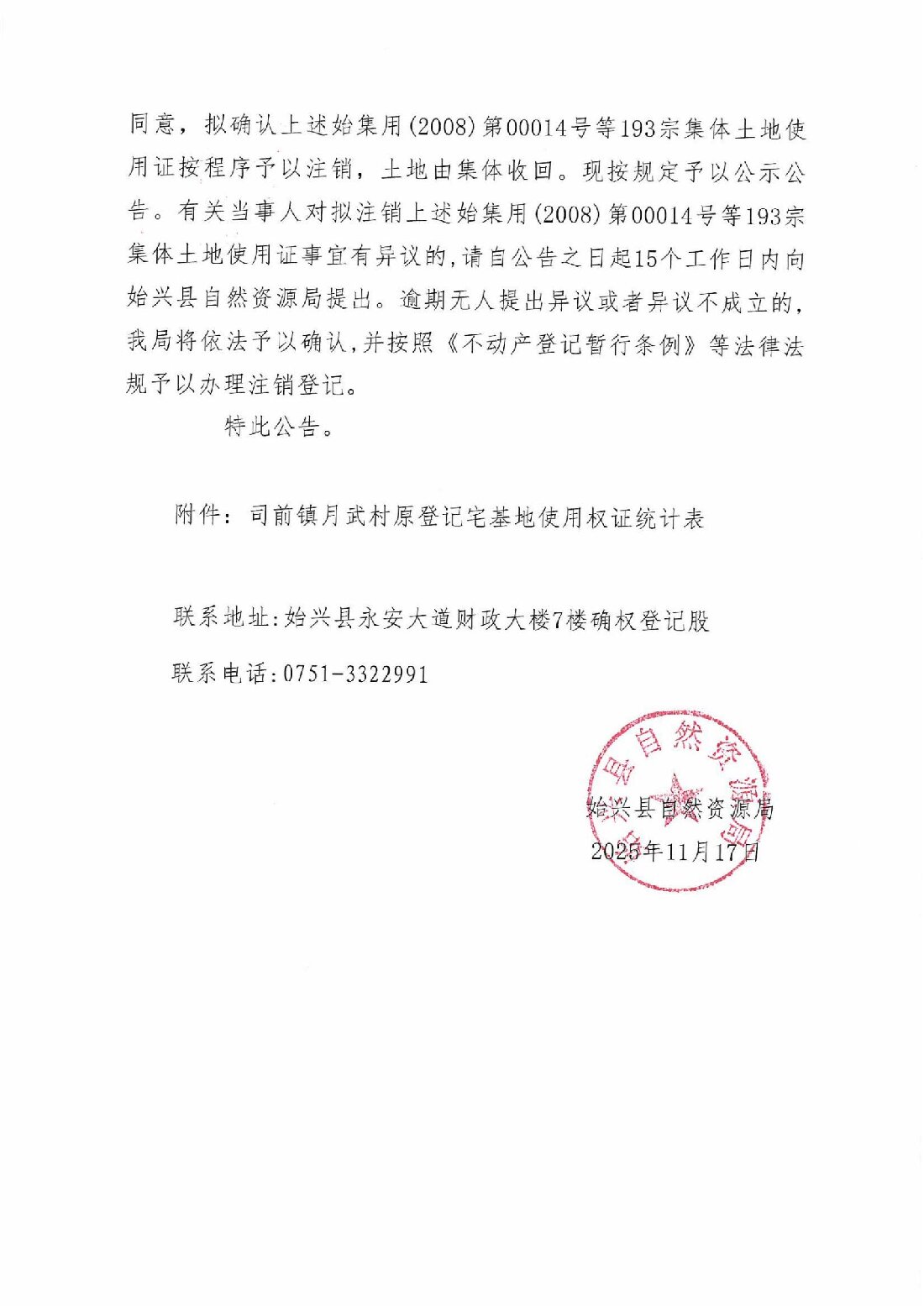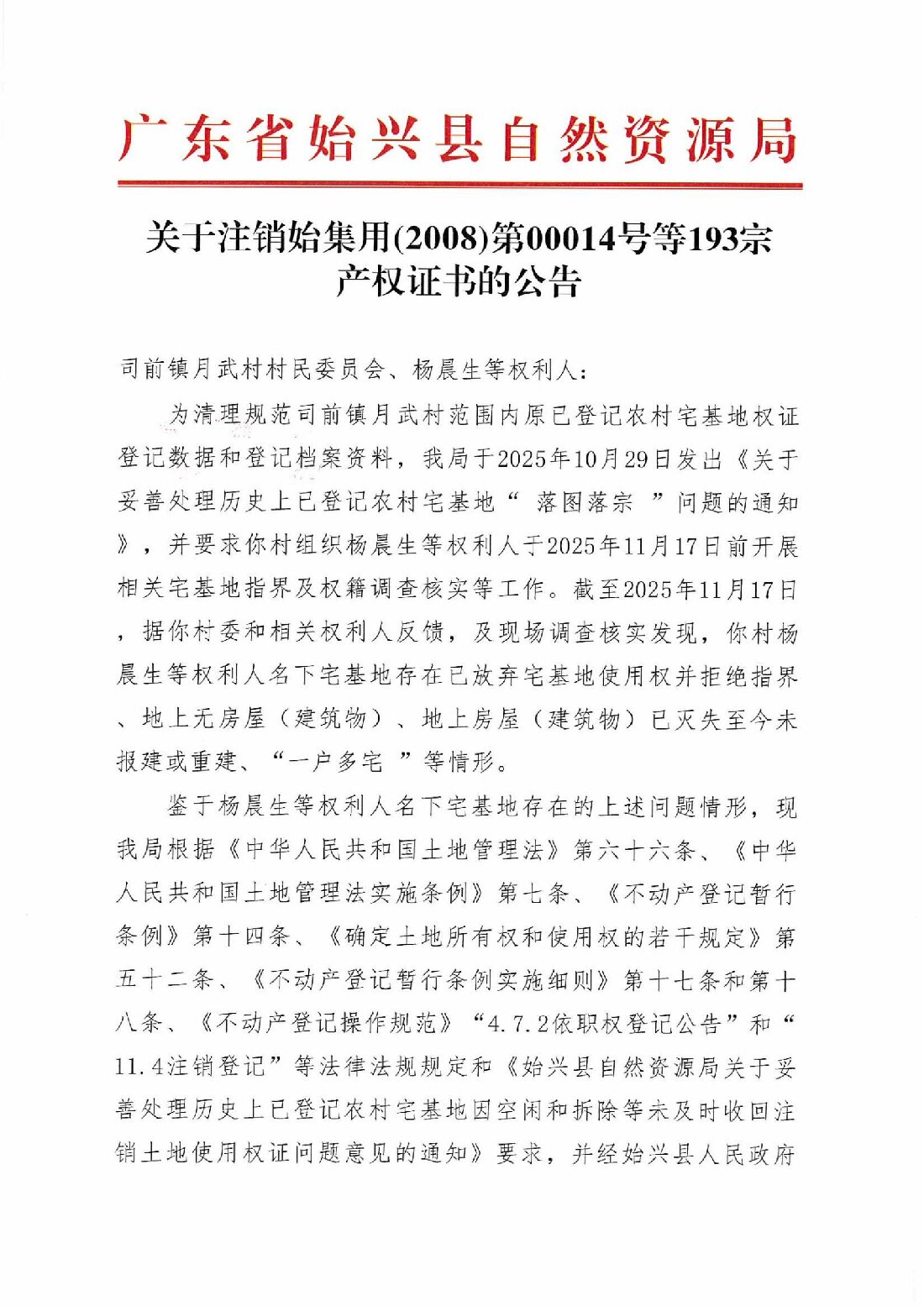 關于注銷始集用(2008)第00014號等193宗產權證書的公告