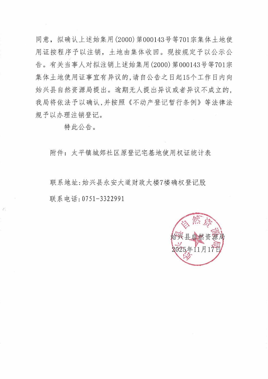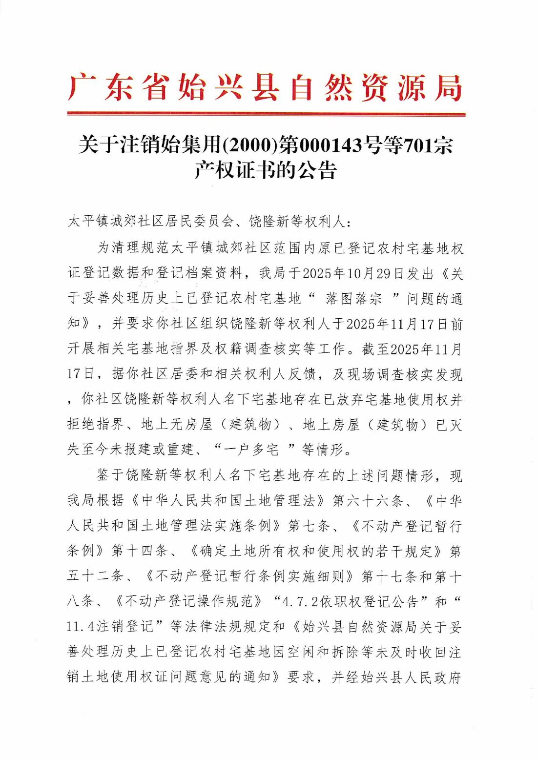 關于注銷始集用(2000)第000143號等701宗產權證書的公告