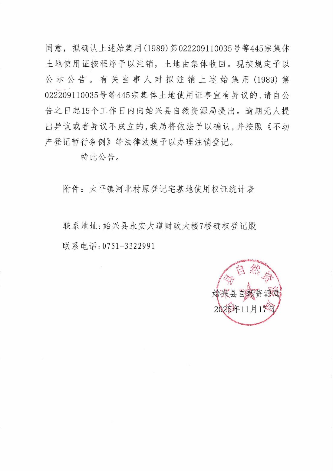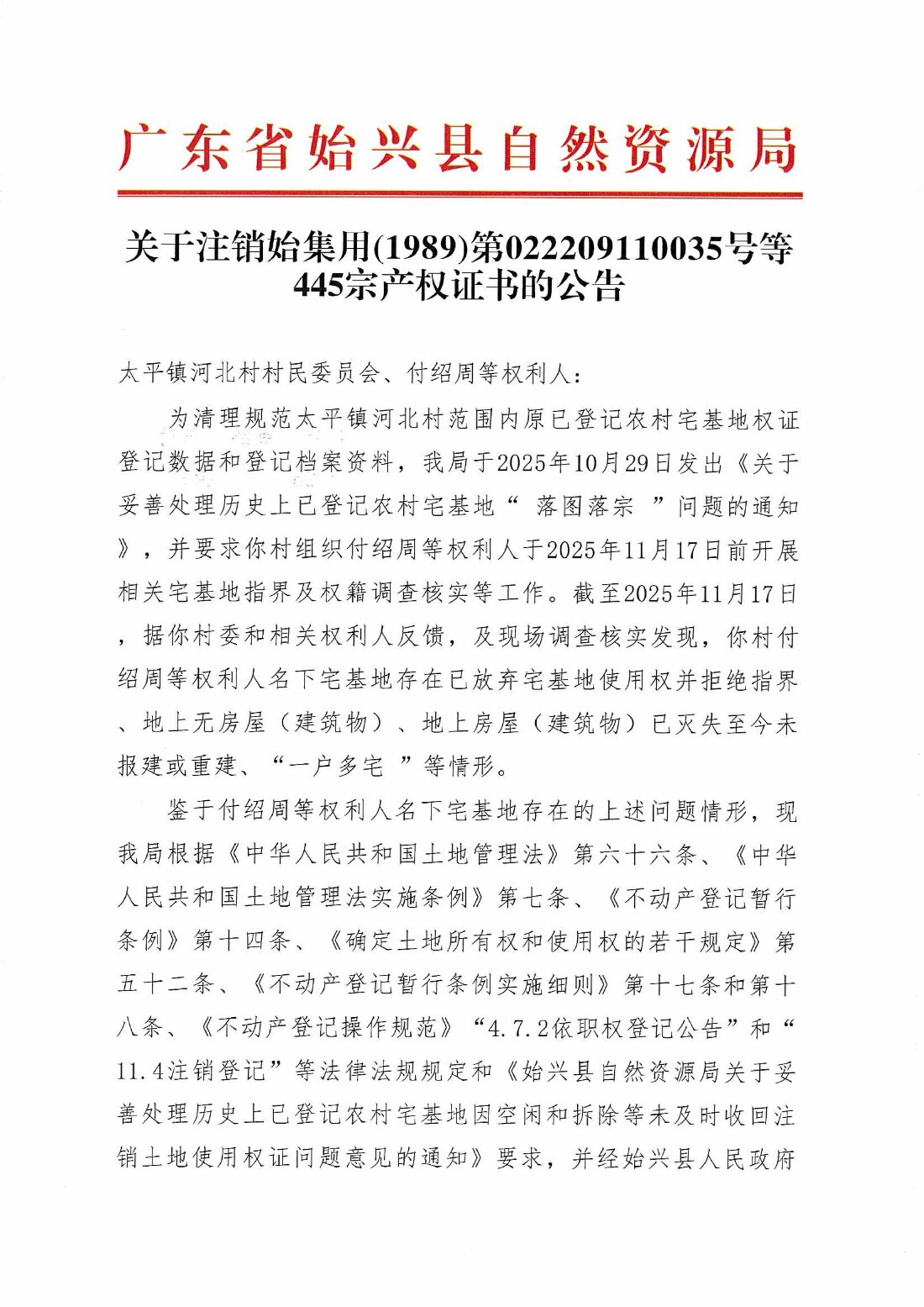 關于注銷始集用(1989)第022209110035號等445宗產權證書的公告