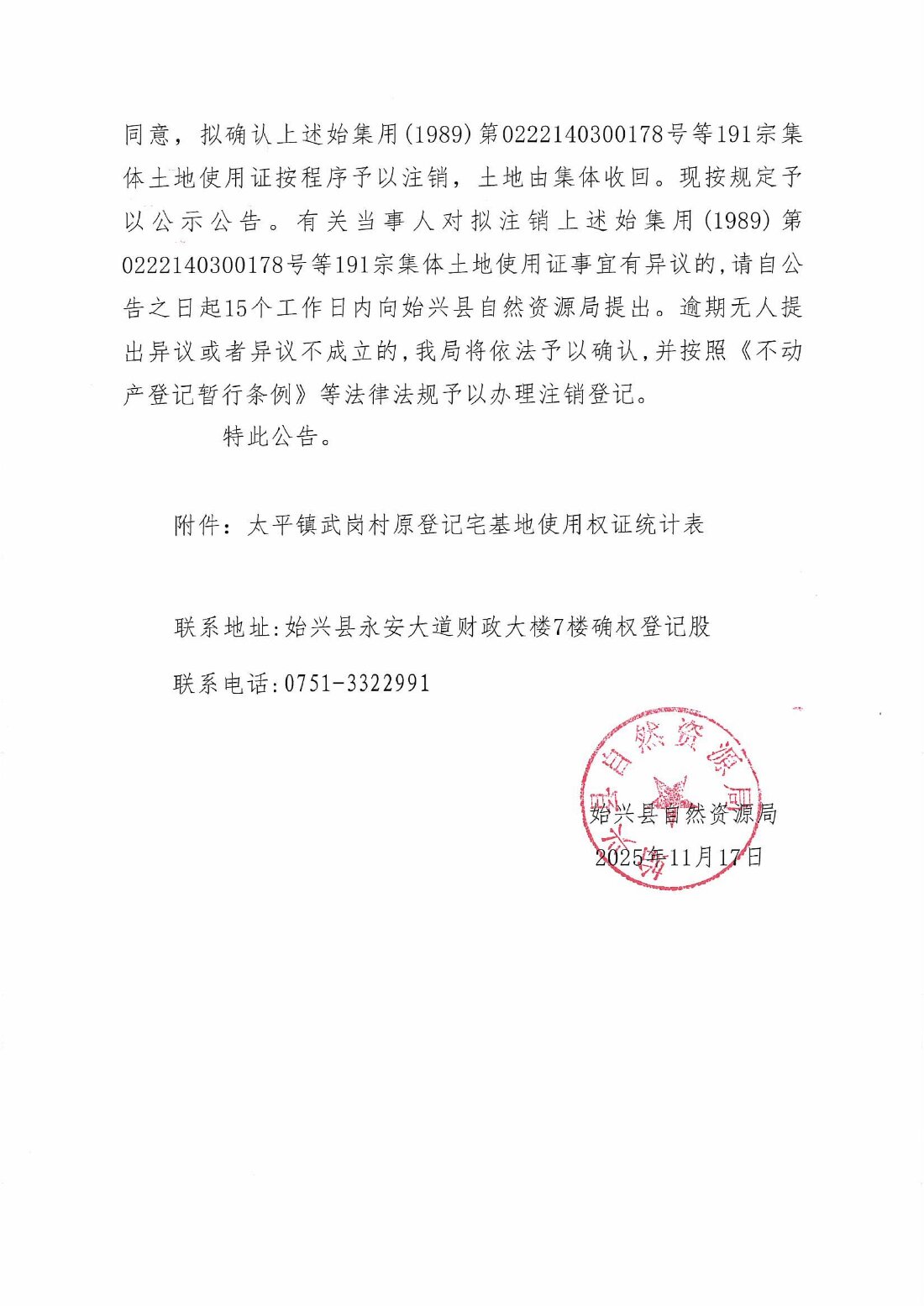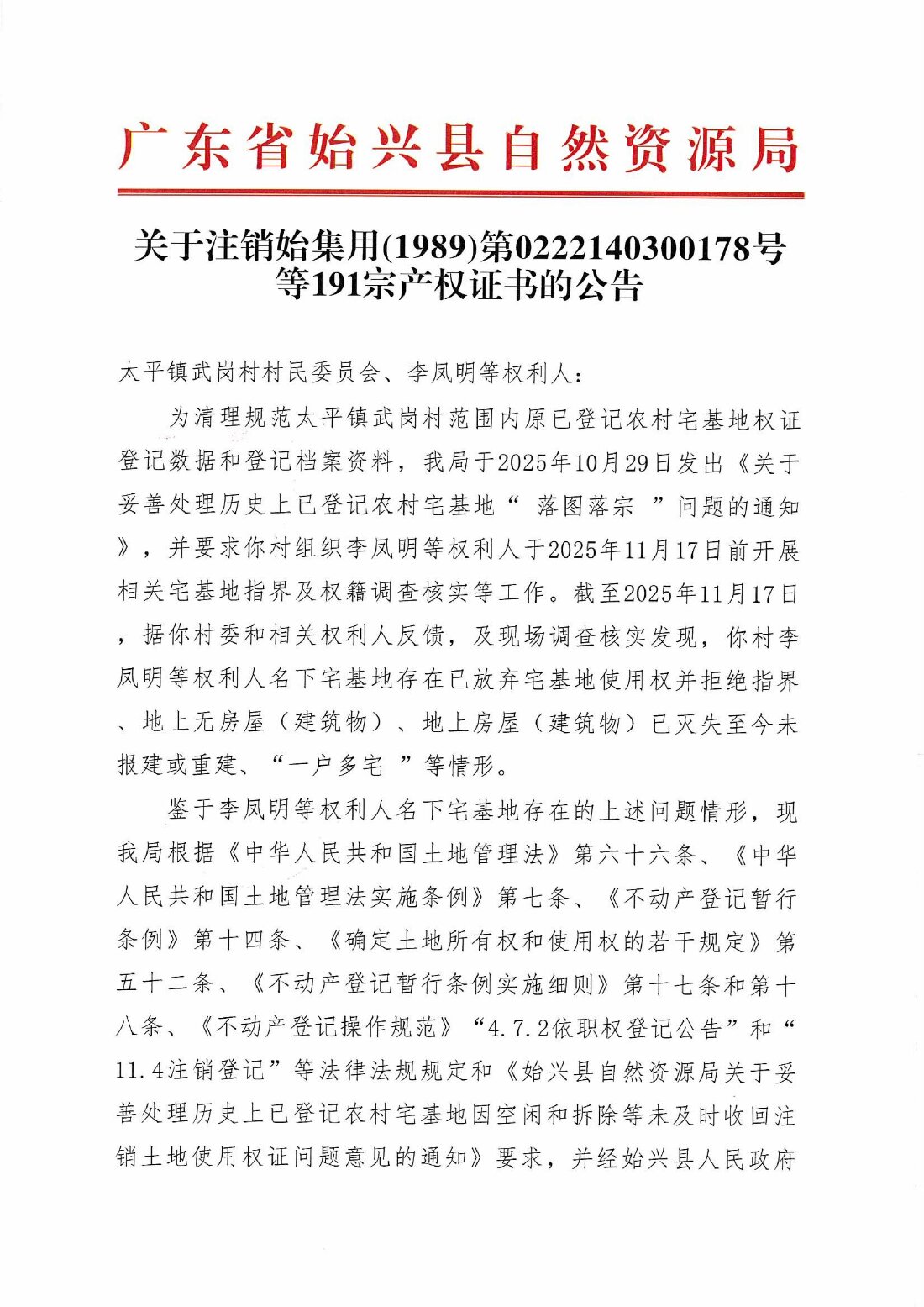 關于注銷始集用(1989)第0222140300178號等191宗產權證書的公告