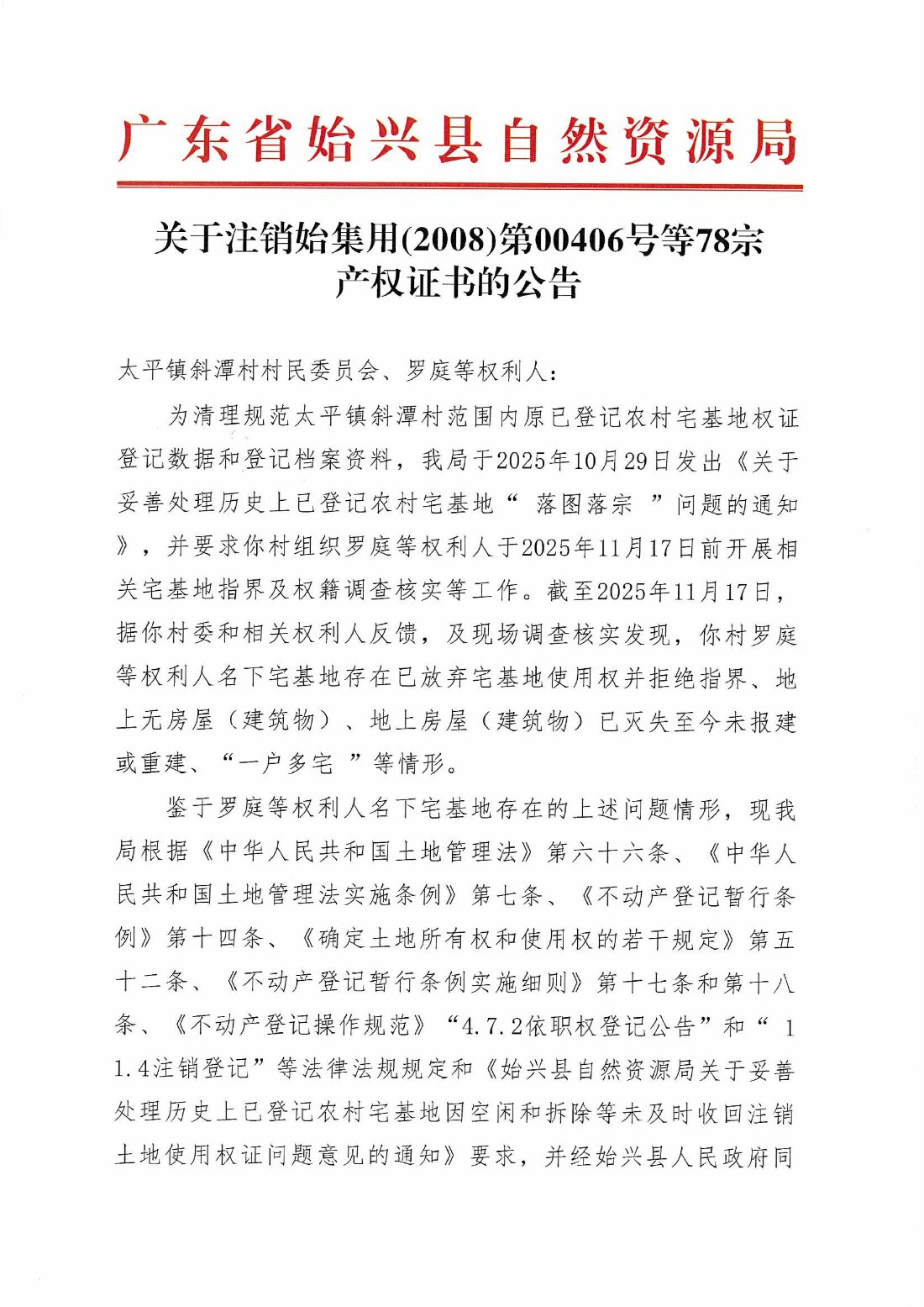 關于注銷始集用(2008)第00406號等78宗產權證書的公告