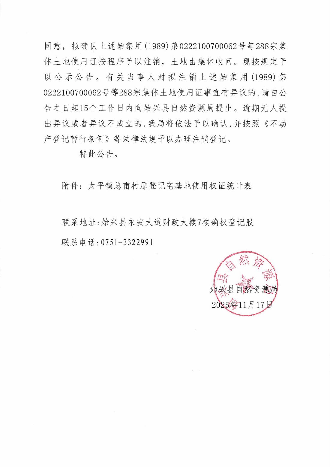 關于注銷始集用(1989)第0222100700062號等288宗產權證書的公告
