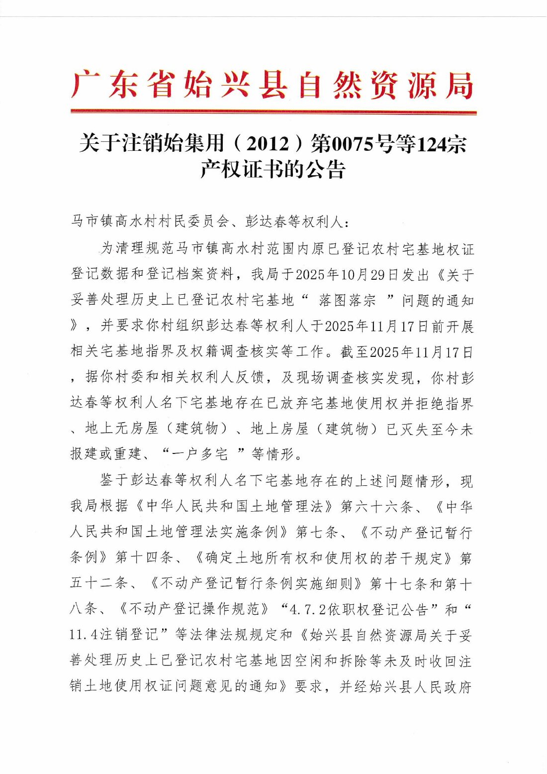關于注銷始集用(2012)第0075號等124宗產權證書的公告