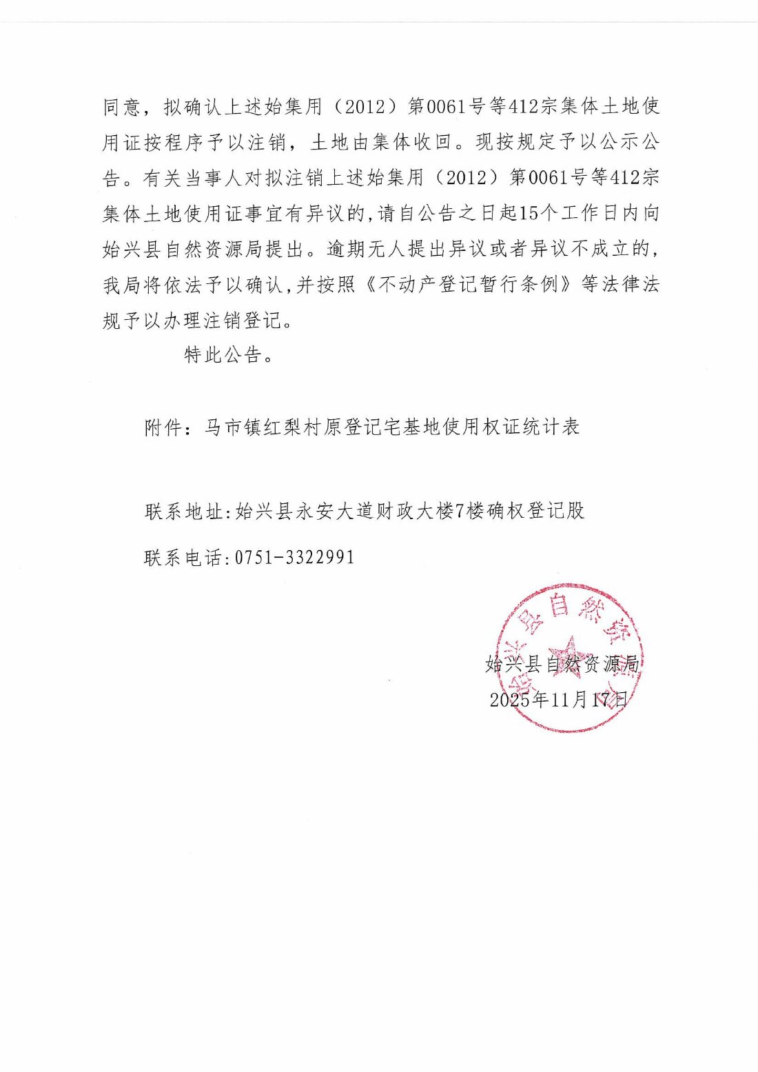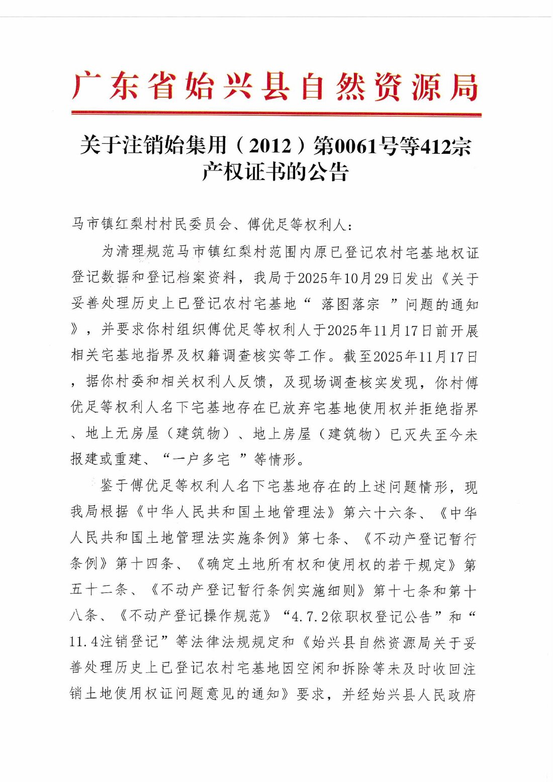 關于注銷始集用(2012)第0061號等412宗產權證書的公告