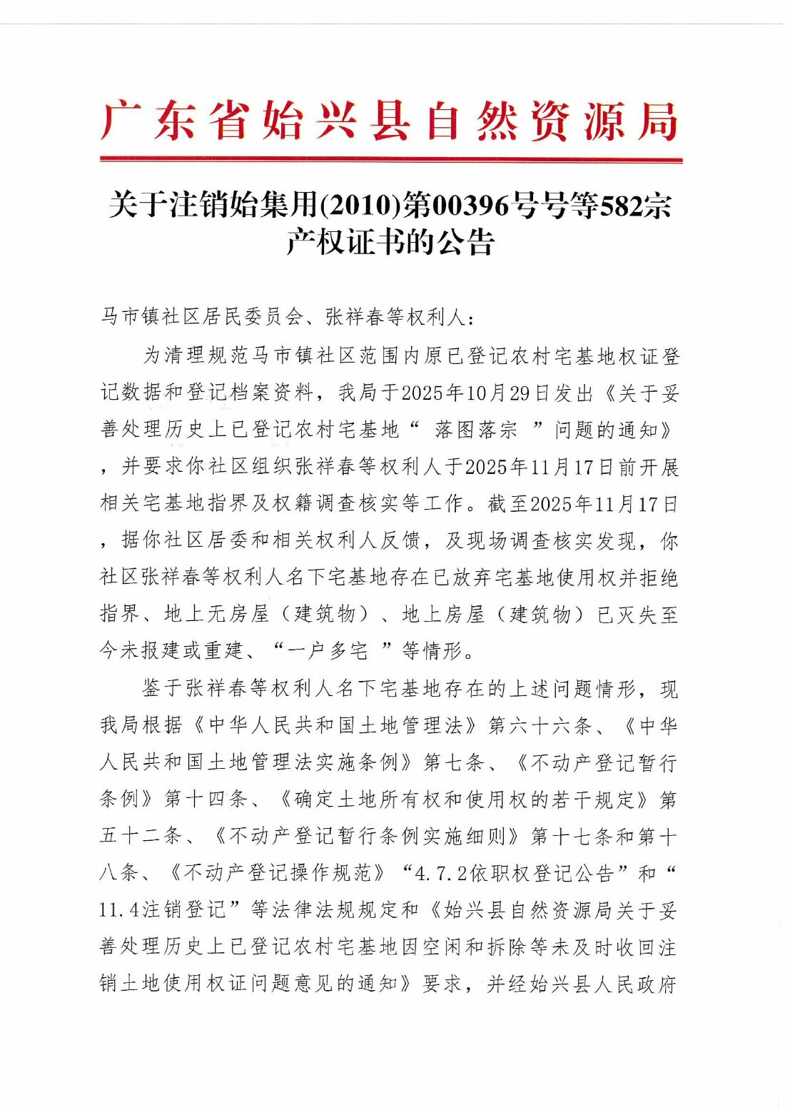 關于注銷始集用(2010)第00396號等582宗產權證書的公告