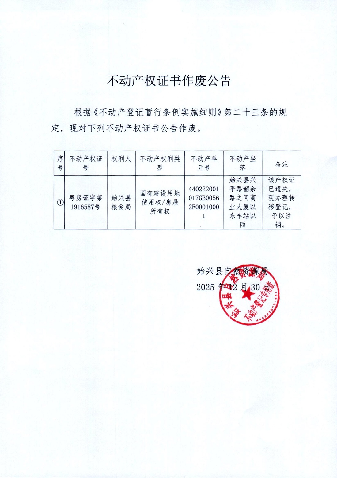 不動產權證書作廢公告(始興縣糧食局)