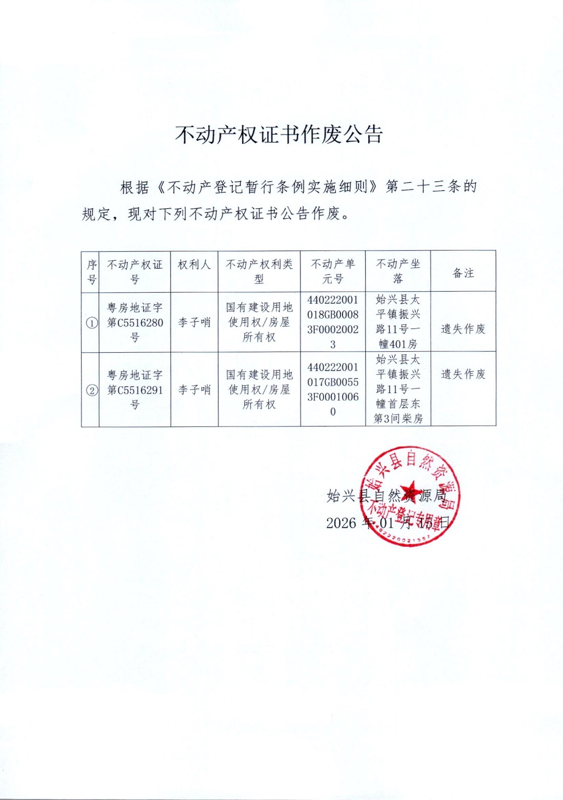 不動(dòng)產(chǎn)權(quán)證書作廢公告