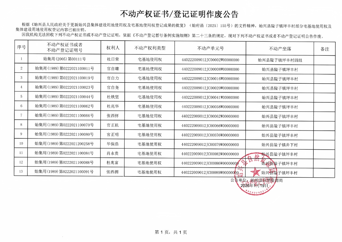 不動(dòng)產(chǎn)權(quán)證書/登記證明作廢公告(隘子鎮(zhèn)坪豐村)