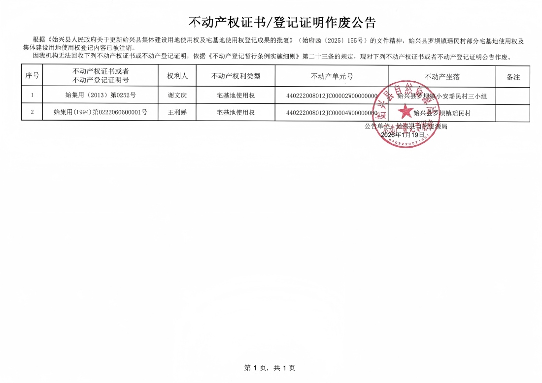 不動(dòng)產(chǎn)權(quán)證書(shū)/登記證明作廢公告(羅壩鎮(zhèn)瑤民村)