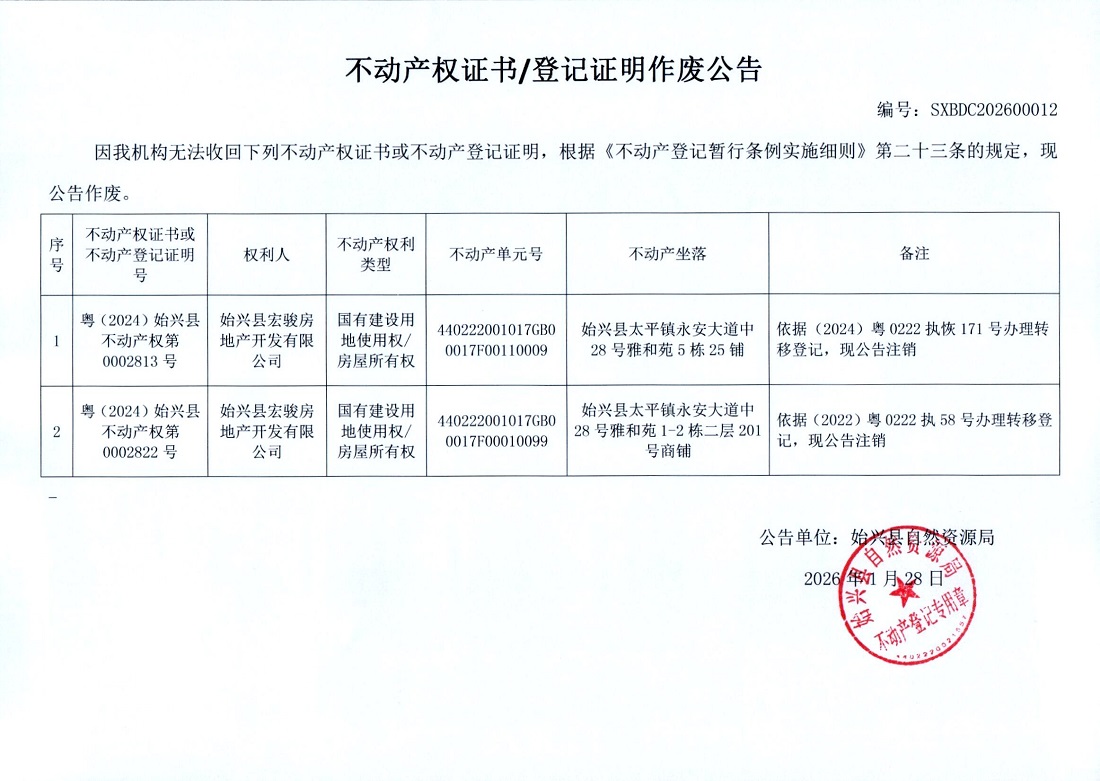 不動(dòng)產(chǎn)權(quán)證書/登記證明作廢公告(始興縣宏駿房地產(chǎn)開發(fā)有限公司)