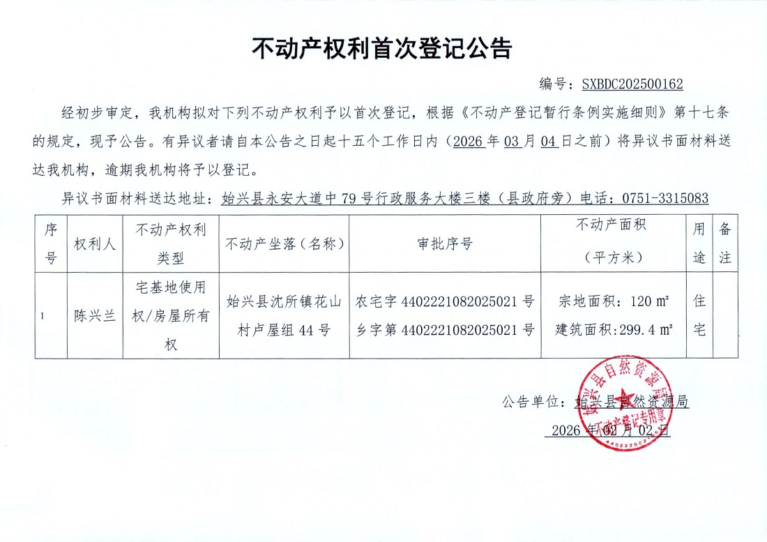 不產權利首次登記公告