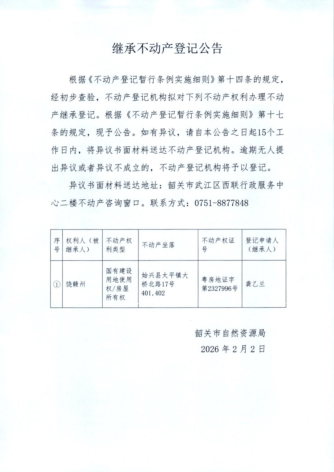 繼承不動(dòng)產(chǎn)登記公告