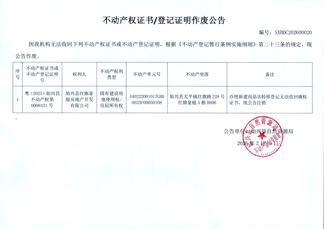 不動產(chǎn)權證書/登記證明作廢公告(始興縣紅旗豪庭房地產(chǎn)開發(fā)有限公司)