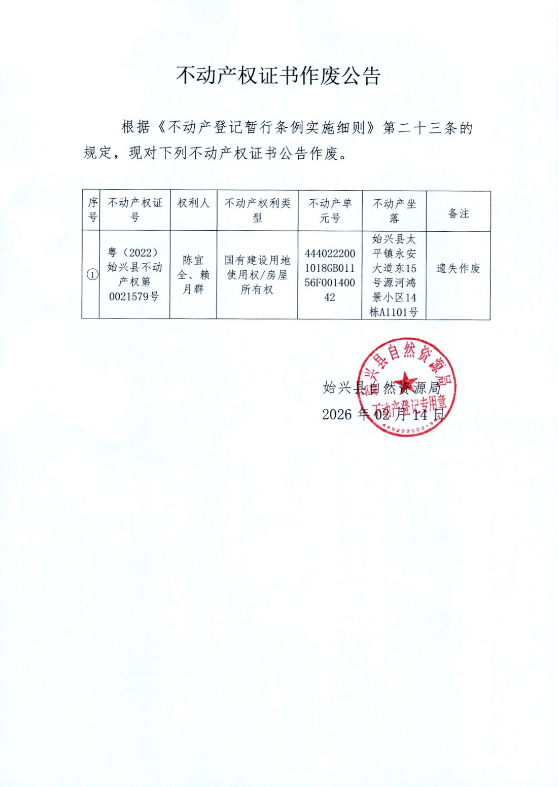 不動產(chǎn)權(quán)證書作廢公告(陳宜全、賴月群)