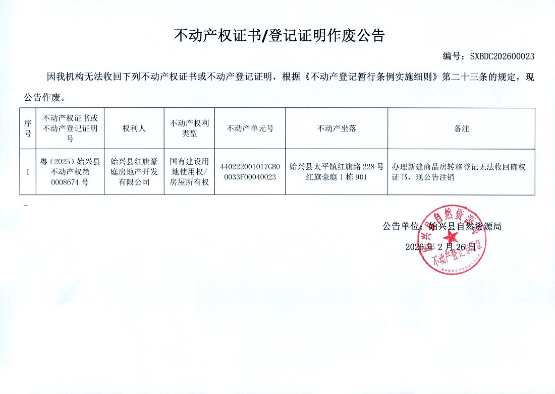 不動產(chǎn)權(quán)證書/登記證明作廢公告(始興縣紅旗豪庭房地產(chǎn)開發(fā)有限公司)